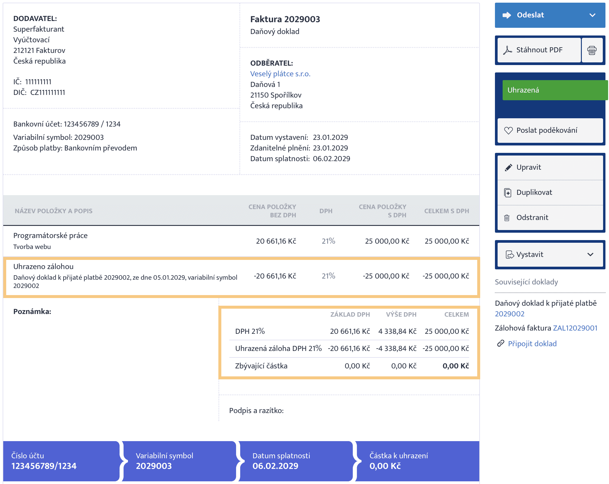 Příklad: Klientovi Veselý plátce s.r.o. jste dne 02.01.2029 vystavili zálohovou fakturu, kterou klient uhradil ve dvou platbách. Pro každou přijatou platbu jste vytvořili jeden daňový doklad k přijaté platbě. Následně po dokončení programátorských prací jste klientovi vystavili vyúčtovací fakturu s vyúčtováním přijatých zálohových plateb a konečnou částkou 0 Kč.
