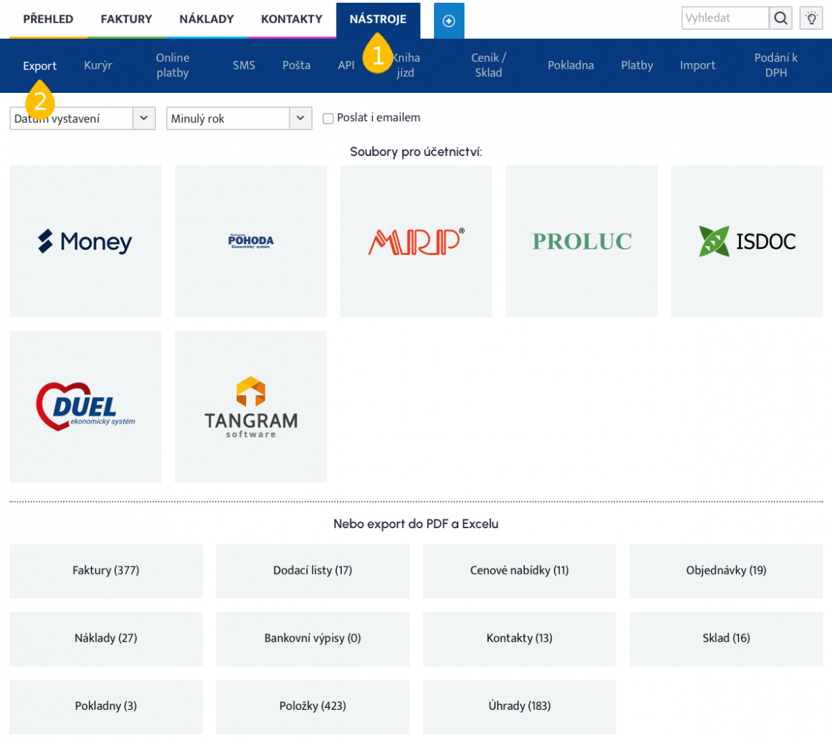 - Potřebujete data pro účetní? Pošlete jí je přesně ve formátu, který si může rovnou naimportovat do svého účetnictví, nebo účetní rovnou vytvořte přístup, ať si je může vyexportovat vždy, když bude potřebovat. Podporujeme všechny nejrozšířenější účetní programy na našem trhu: Money, Pohoda, MRP, PROLUC, DUEL, Tangram software i standard ISDOC.