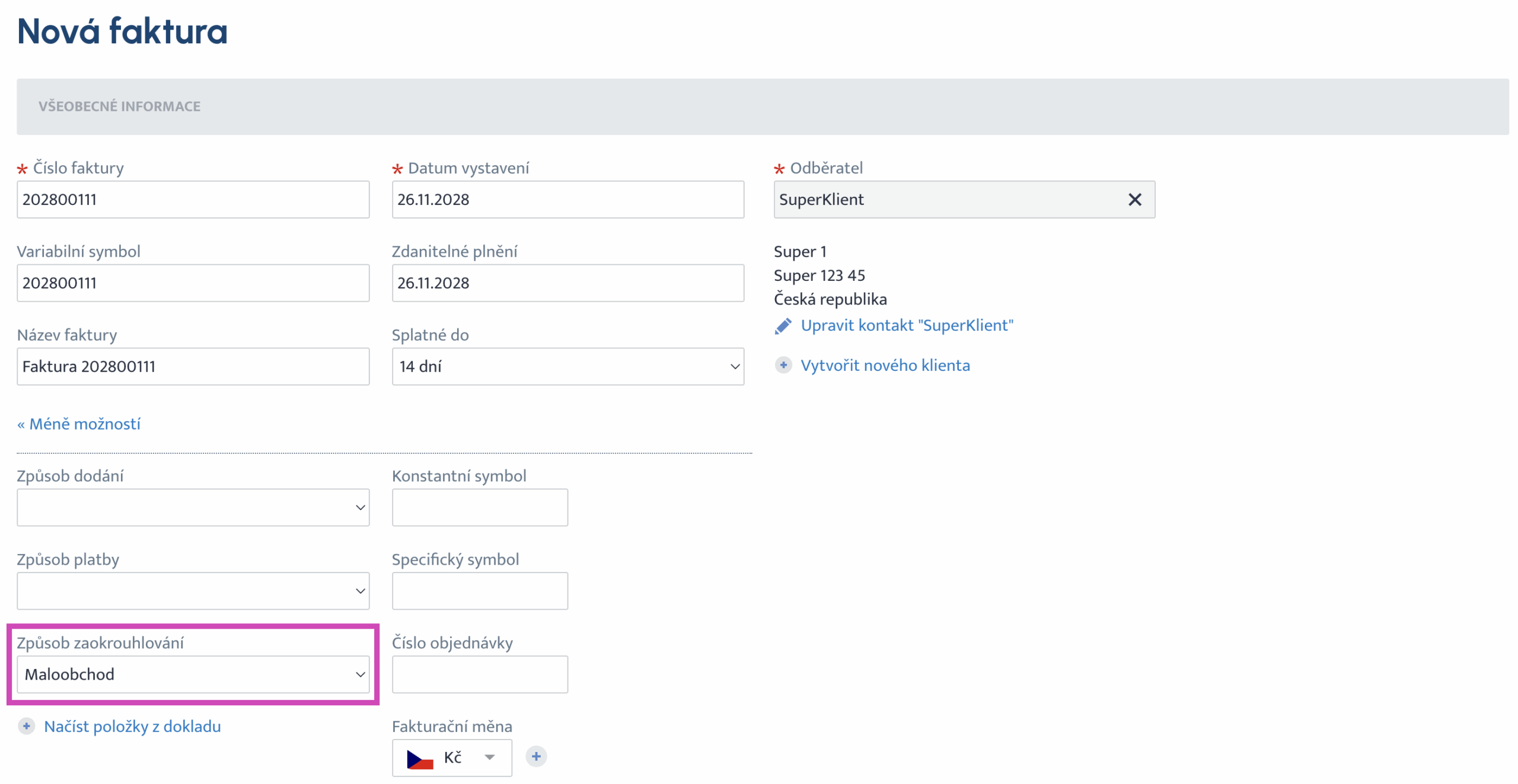 Kvůli jednomu dokladu tak není potřeba sahat do globálního nastavení – způsob si vyberete z více možností přímo na dokladu a výsledek vidíte okamžitě. Zaokrouhlování tak snadno přizpůsobíte každé konkrétní situaci.