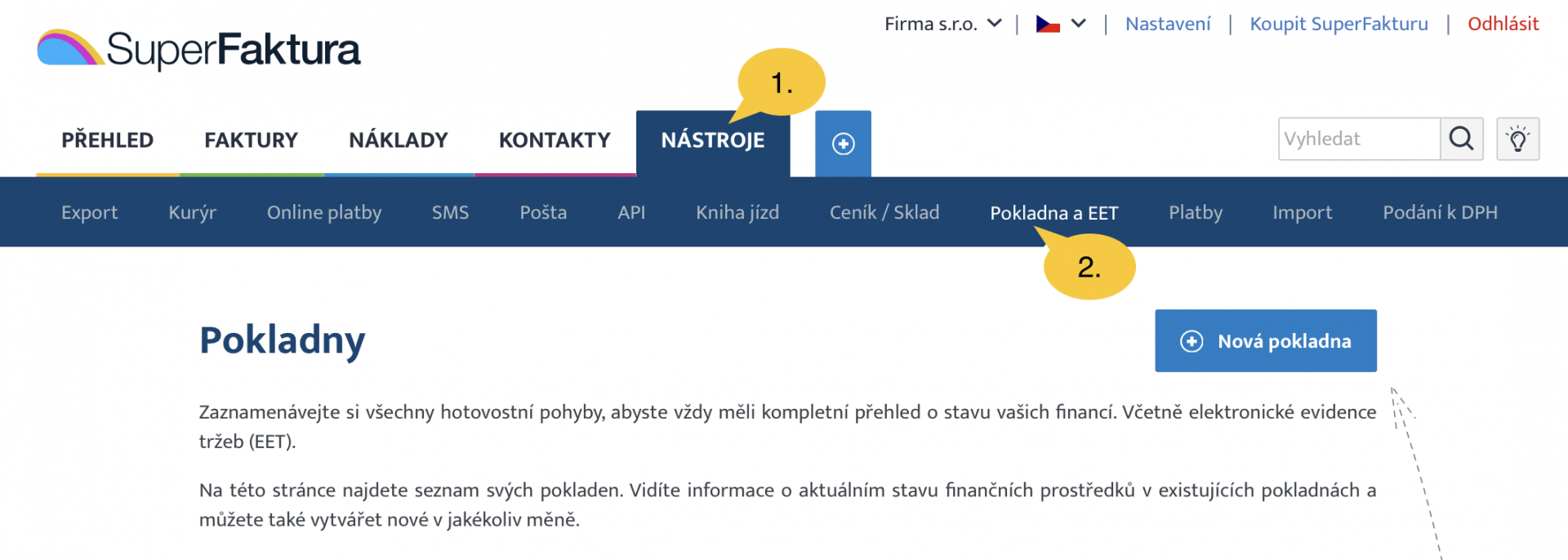 V SuperFaktuře vyberte Nástroje >> Pokladna a EET. Zde si můžete jednoduše vytvořit pokladnu, kterou posléze propojíte s vaším eshopem. Pokud chcete pokladnu používat a evidovat v režimu EET, nastavte si nejdříve pokladnu podle našeho návodu.